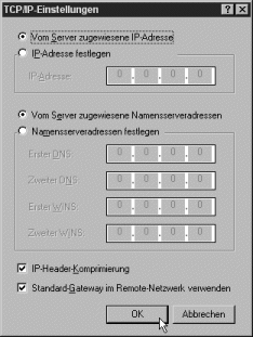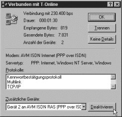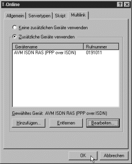 Die Standard-Gateway im Remote-Netzwerk muss verwendet werden.ISDN-Nutzer (und natürlich auch Leute, die über mehrere Modems am Rechenr verfügen) könnn jetzt noch in der Registerkarte Multilink zusätzliche Verbindungsleitungen konfigurieren, die die Verbindung dann zwar schneller (bis ISDN bis zu 128 kBit/s) aber auch teuer macht. Zu den Tarifen siehe bitte in den Tipps und Tricks...
