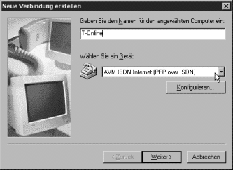 Wähle selbst einen Namen für die neue Verbindung und selektiere ein Modem. Im Beispiel soll die Verbindung T-Online genannt werden und das 'Modem' ist ein Pseudo-Modem, das vom CAPIPORT-Treiber der Firma AVM für deren ISDN-Karte Fritz! zur Verfügung gestellt wird.