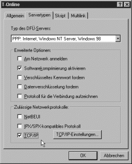 Typ des DFÜ-Servers: PPP: Internet, .... Windows 98, ...
