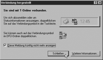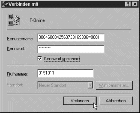 Nach Anklicken von Verbinden wird dein Rechner mit T-Online verbunden. Es erscheinen kleine Status-Menues, in denen mitgeschrieben wird, was gerade passiert. Wählen, Kennworte prüfen und letztendlich: